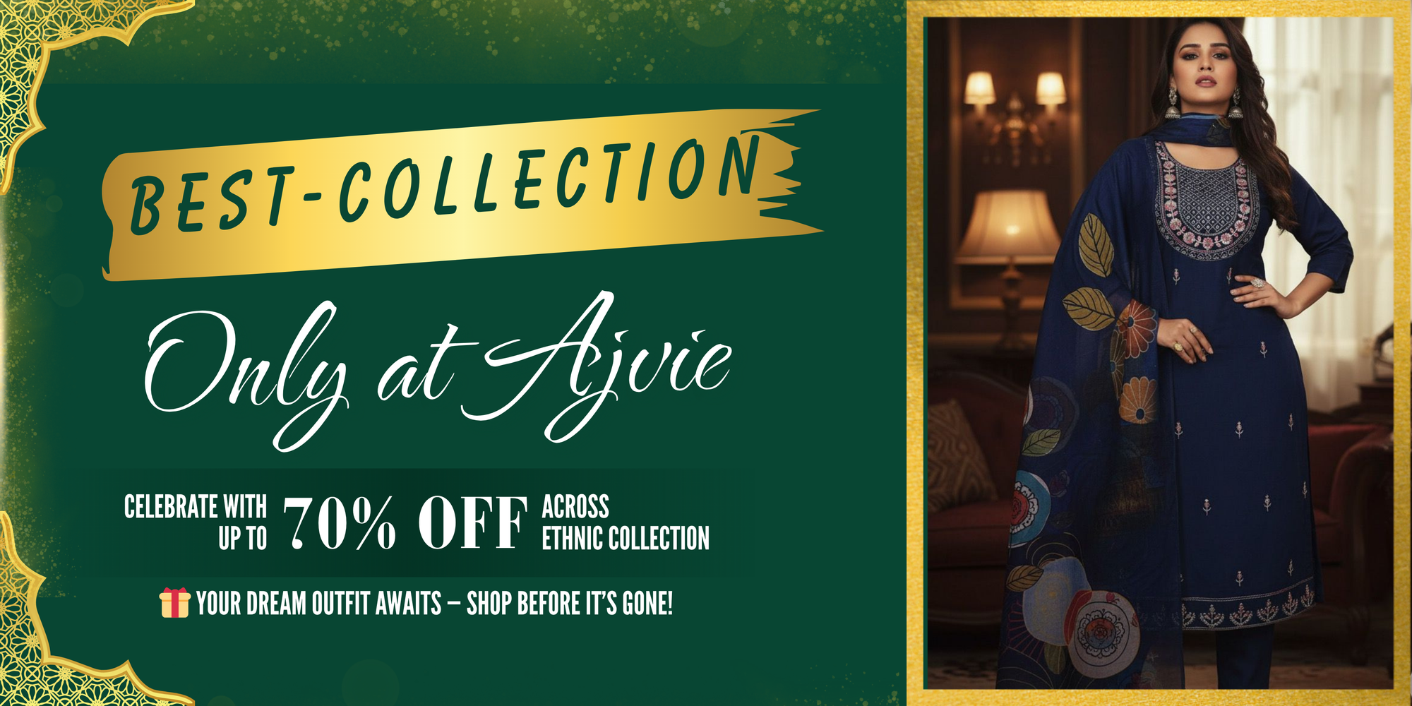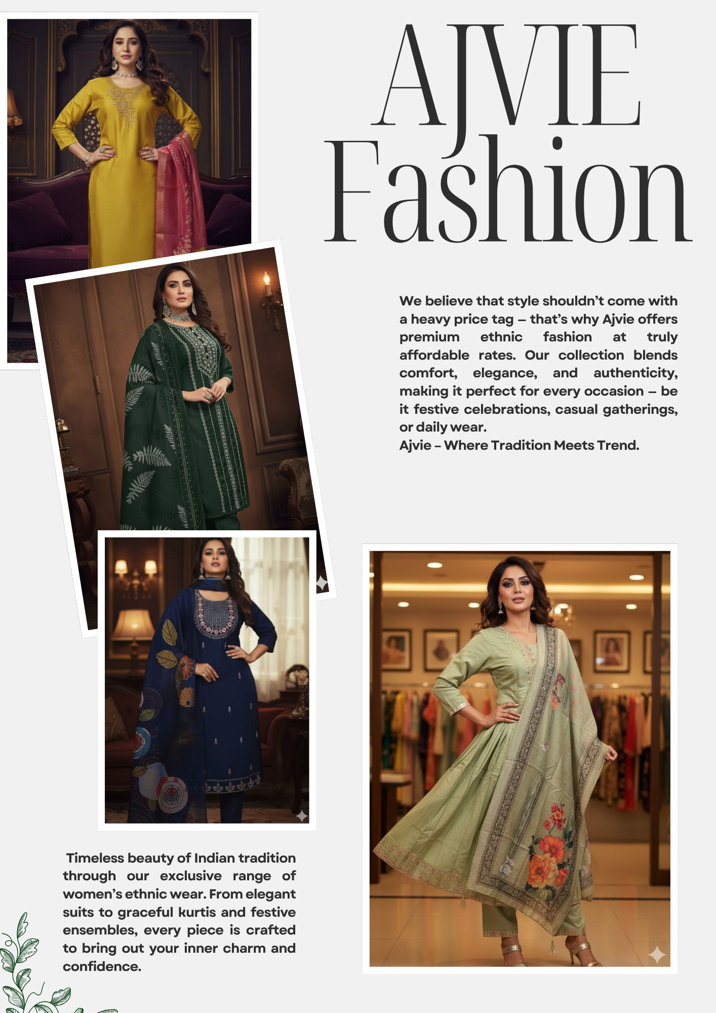 Welcome to Ajvie, your destination for elegant and affordable women’s ethnic wear. We are passionate about bringing India’s rich heritage and craftsmanship to modern wardrobes. Every outfit at Ajvie is thoughtfully designed to blend traditional artistry with contemporary style, giving you a look that’s graceful, comfortable, and effortlessly chic.