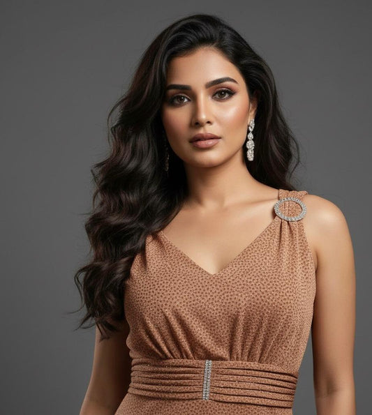 AJVIE Women’s Glamorous V-Neck Sleeveless Party Wear One Piece Dress – Bronze