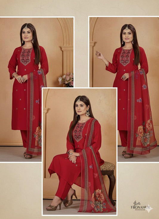 Roman Silk - Designer Maroon Suit with Kurtis + Pant + Dupatta
